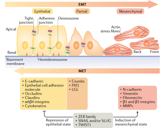 • Con đường chuyển dạng biểu mô / trung mô (EMT): tế bào ung thư vốn “ngoan ngoãn”, dính chặt với nhau, bỗng đổi tính, chuyển dạng trở nên linh hoạt, trơn tuột, dễ bò đi.