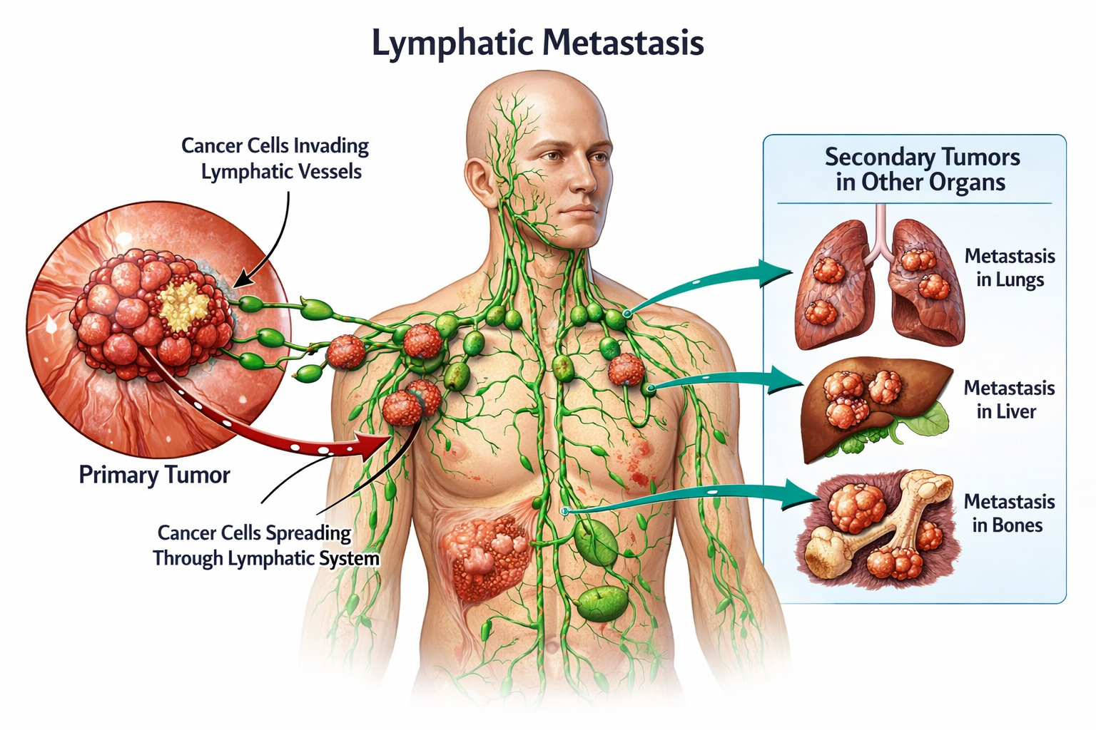 Di căn bạch huyết là quá trình tế bào ung thư rời khỏi khối u nguyên phát, xâm nhập vào hệ thống mạch bạch huyết và di chuyển đến các hạch vùng. Tình trạng hạch dương tính thường là yếu tố quan trọng trong phân giai đoạn bệnh và tiên lượng.