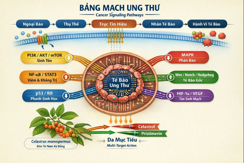 Sinh học phân tử gọi chúng bằng những cái tên kỹ thuật: PI3K/AKT/mTOR, MAPK, NF-κB/STAT3, Wnt/Notch/Hedgehog, p53/RB, HIF-1α/VEGF.
